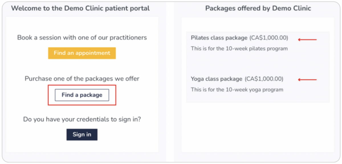 If you’ve made packages available for purchase on your online booking portal, your patients/clients will see Find a package. They can easily purchase one of the available packages using a credit card!