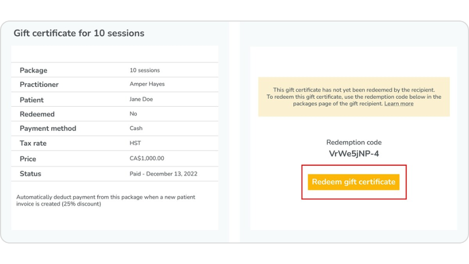 - Gift certificates are a type of package paid for by one patient and redeemed by another. The person purchasing a gift certificate cannot use it for themselves.